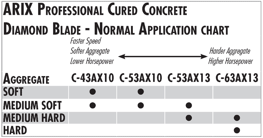 C-53AX Pro The Pro V ARIX offers the broadest everyday applications of this series of blades. Excellent for medium to high horsepower saws in most types of materials. Cuts well even in hard aggregates, but has its best cost per cut ratios in soft and medium aggregates.When we say ARIX changes everything, this includes the way you select the best blade for your sawing application. Instead of knowing the average diamond concentration in a segment, we offer you a more precise diamond count. This permits a more accurate horsepower to diamond ratio assessment, for a more accurate selection of the right ARIX blade for your application.